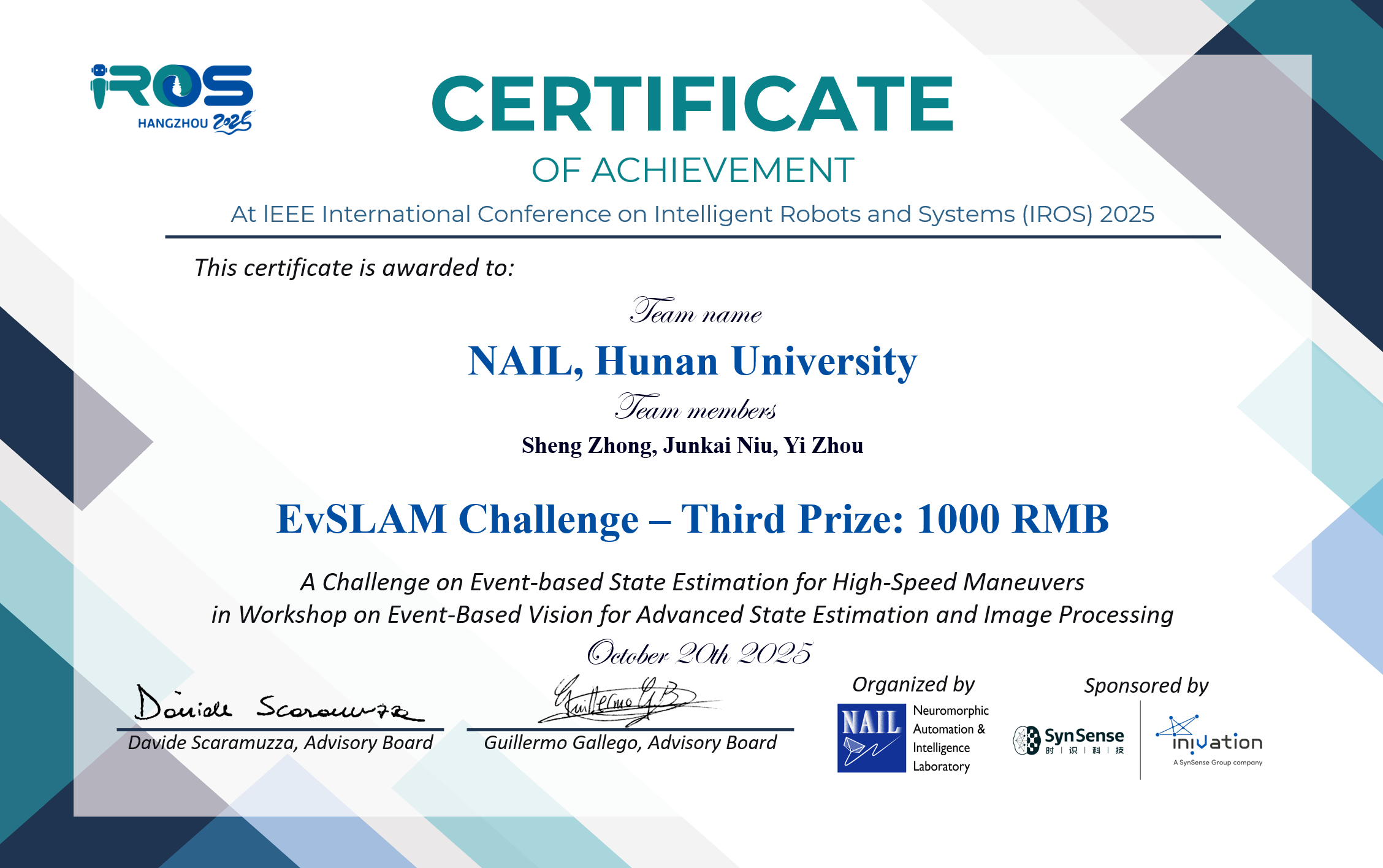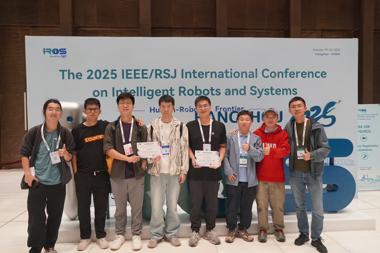 2025年10月19日至25日,IEEE/RSJ智能机器人与系统国际会议(IROS 2025)在杭州国际博览中心隆重举行。NAIL实验室多名师生赴杭州参加了此次学术盛会。在会议期间,周易教授主持举办以”Event-based Vison for Advanced State Estimation and Image Processing”主题的Workshop,实验室博士生牛军凯、钟声、王昕与硕士生孙凯振参与协助。博士生钟声和牛军凯共同参与该Worksho下属的EvSLAM Challenge比赛,斩获第三名的优异成绩。博士生白银龙与硕士生孙凯振分别以口头报告形式分享了他们的前沿工作。