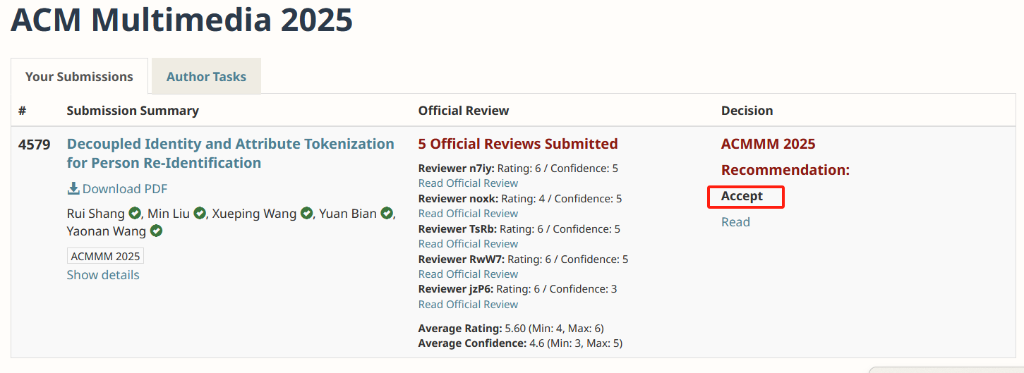 尚睿同学作为第一作者,刘敏教授与王学平副教授作为通讯作者的论文“Decoupled Identity and Attribute Tokenization for Person Re-Identification”,被人工智能领域顶级国际会议ACM International Conference on Multimedia(ACM MM)录用。该会议是中国计算机学会(CCF)推荐的A类国际学术会议,由美国计算机协会(ACM)主办,自1993年首次举办以来,已成为人工智能领域学术界与工业界交流的重要平台。该研究针对行人重识别任务,创新提出身份-属性解耦化语义提示方法,通过分离行人特征表示显著提升模型判别力,在Market-1501、MSMT17等主流数据集上性能超越现有最优方法。